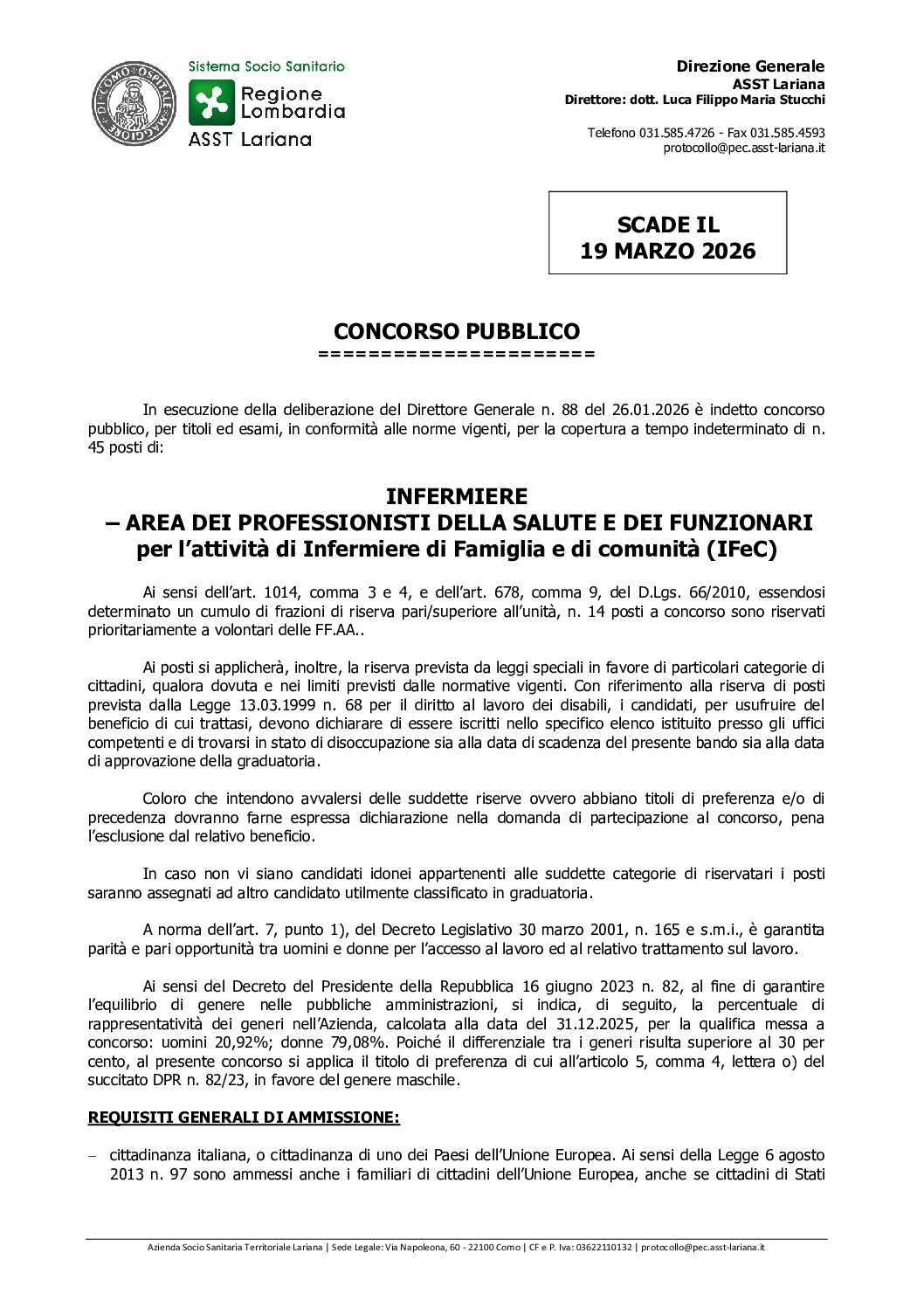 E’ indetto concorso pubblico, per titoli ed esami, in conformità alle norme vigenti, per la copertura a tempo indeterminato di n. 45 posti di: INFERMIERE – AREA DEI PROFESSIONISTI DELLA SALUTE E DEI FUNZIONARI per l’attività di Infermiere di Famiglia e di comunità (IFeC)